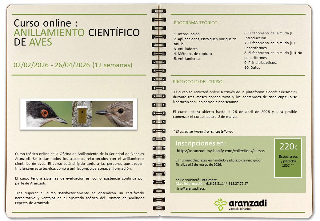 Aranzadi Zientzia Elkarteko Eraztuntze Bulegoko Online ikastaroa da eta bertan hegaztien eraztunketa zientifikoari dagozkion arlo gutiak lantzen dira. Teknika honetan hastapeneko pausuak eman nahi dituztenei zuzendutako ikastaroa da (formakuntzan dauden eraztunleak esaterako). Ikastaroak ebaluazio sistemak ditu eta Aranzadiko antolatzaileek uneoroko laguntza eskeintzen dute. Ikastaroa gainditzekotan, egizatagiria eta Aranzadiko Eraztunle Aditurako azterketan abantailak lortzen dira.