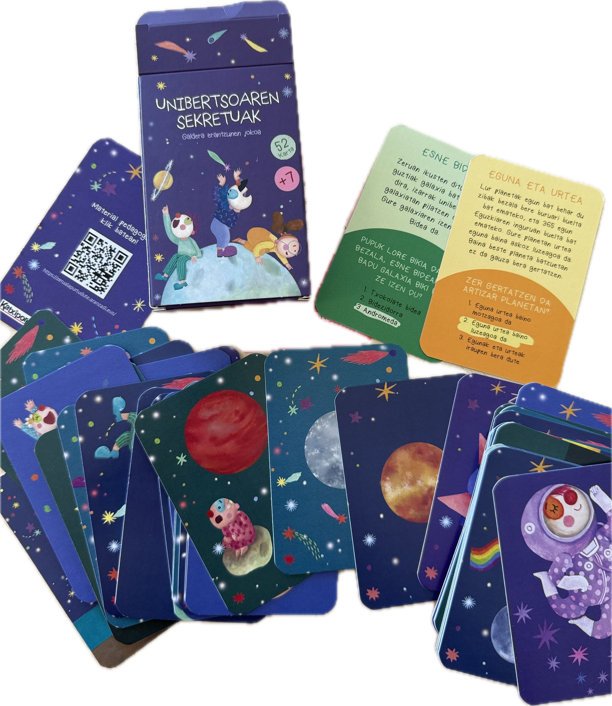 Unibertsoaren sekretuak ezagutzeko karta sorta dibertigarri bat duzu hau. Eguzkia, Lurra, Ilargia, izarrak, planetak, sateliteak, astronomia, astronautak... unibertsoaren berri izango duzu ilustrazio koloretsuz beteriko joko honen bidez. (Hizkuntza: Euskara)